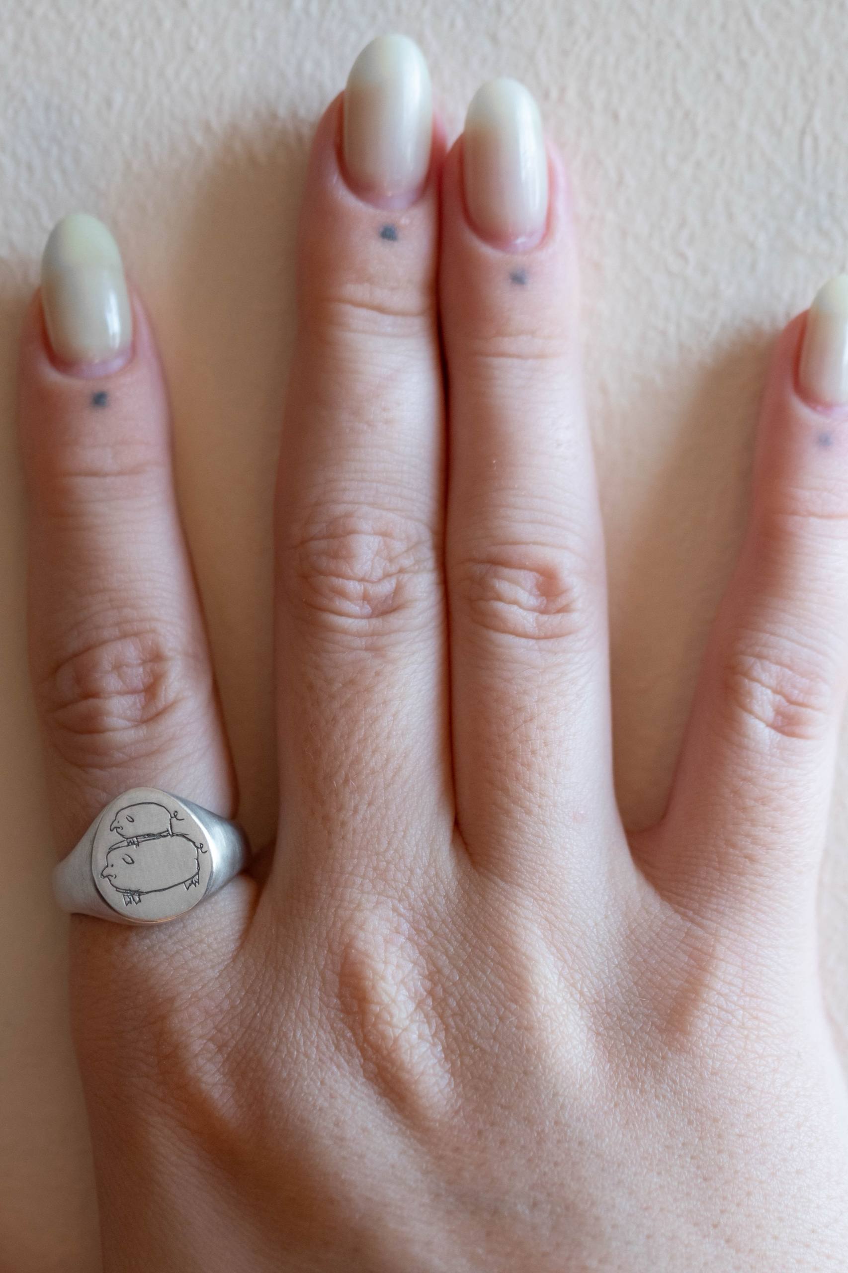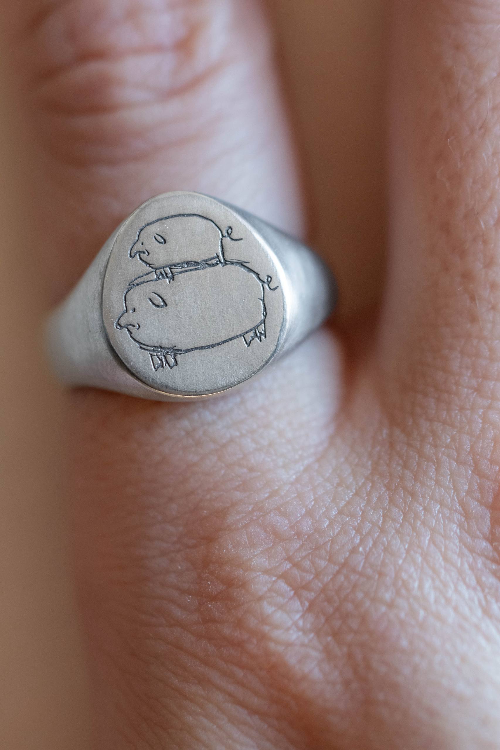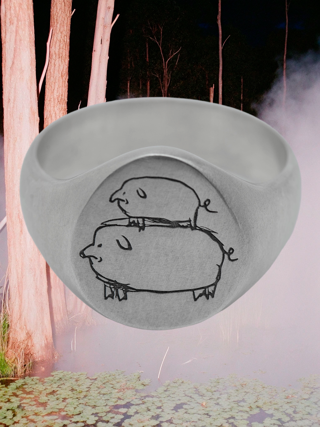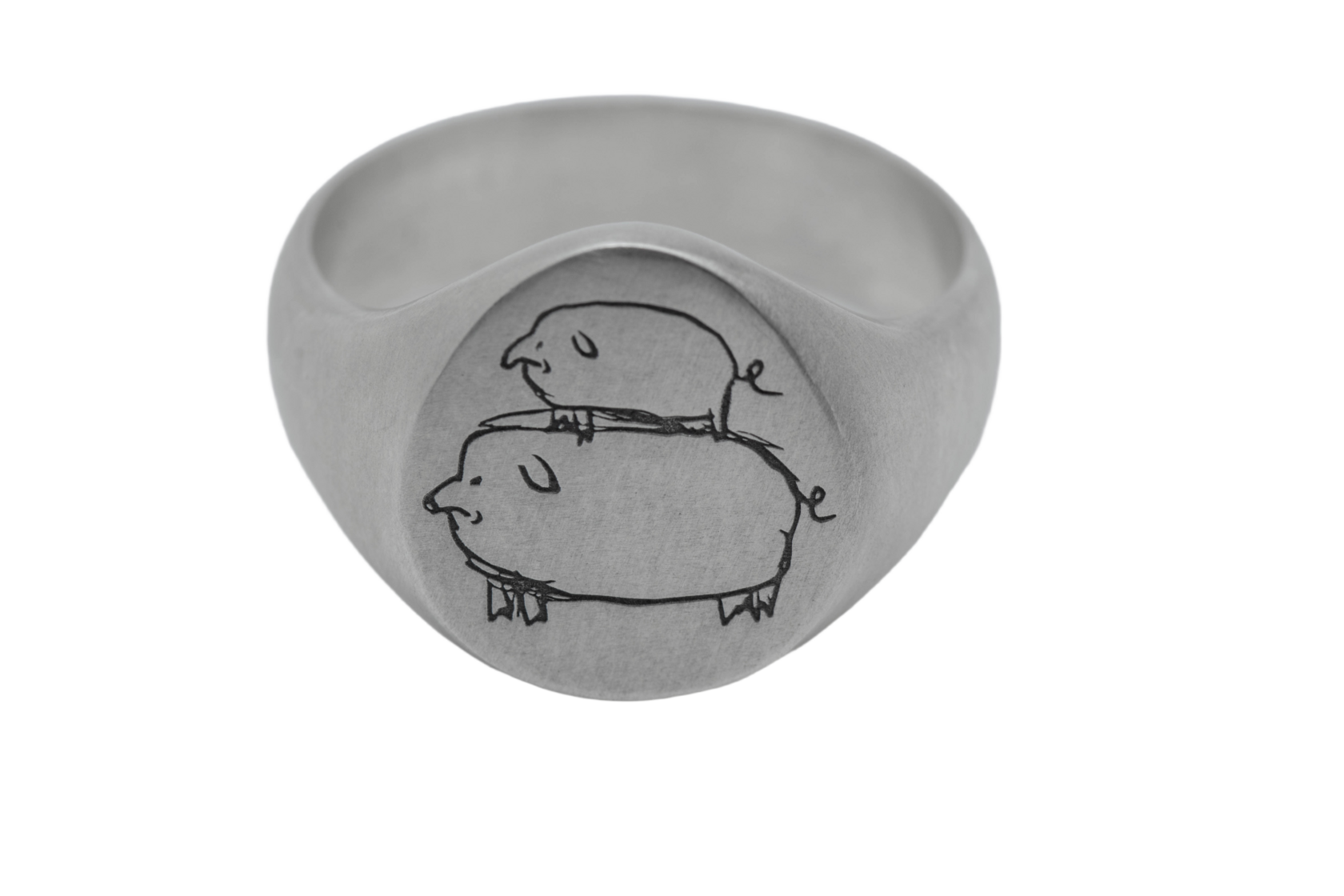 Клянусь, я видела старинный герб со свиньями стоявшими одна на другой, но с тех пор я не могу его найти. Гонимая этой идеей я сделала хаотичный скетч, под него мы сделали форму печатки в форме яйца и вот результат — обожаю это кольцо, одно из моих любимых.